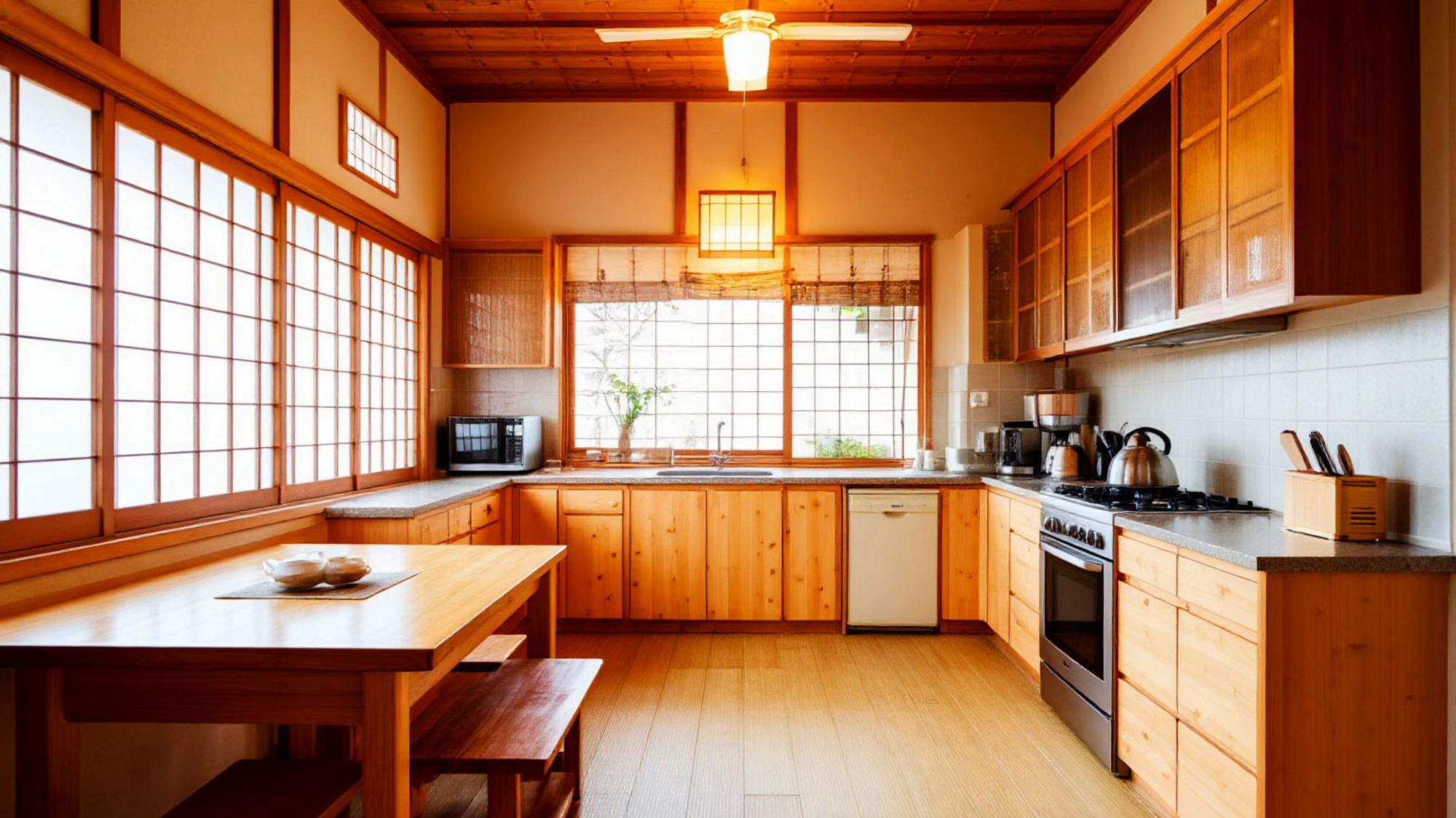 Эта кухня является центром дома, где приятно готовить, принимать гостей и проводить время с семьей. Минимализм японского стиля позволяет сохранять чистоту линий и порядок, а функциональность каждой зоны делает процесс приготовления пищи легким и комфортным. Столешницы из прочных материалов, выдвижные ящики, встроенная техника и организованные системы хранения делают кухню практичной, а светлые фасады и гармоничная цветовая палитра создают атмосферу уюта и спокойствия.
