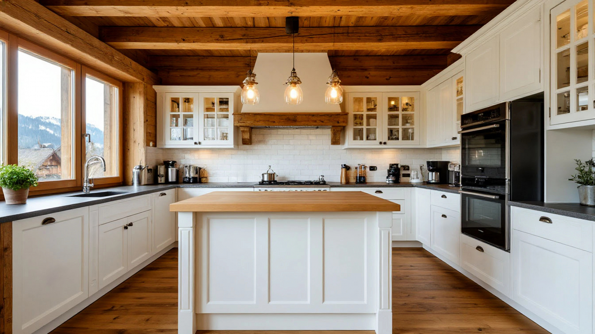 Столешница, подобранная в тоне натурального дерева, создаёт удивительно точный контраст с белыми фасадами. Это классический прием стиля шале, где дерево обязательно присутствует в интерьере, сохраняя тепло и естественность. Текстура дерева выглядит максимально натурально: видны прожилки, микрорельеф и глубокий тон, благодаря которым кухня получает характер, а белая основа — выразительность. Такой дуэт не только эстетически привлекателен, он улучшает восприятие пространства, делает его тактильным, эмоциональным, «живым», и именно это чаще всего ищут в кухнях, вдохновленных альпийскими домами.