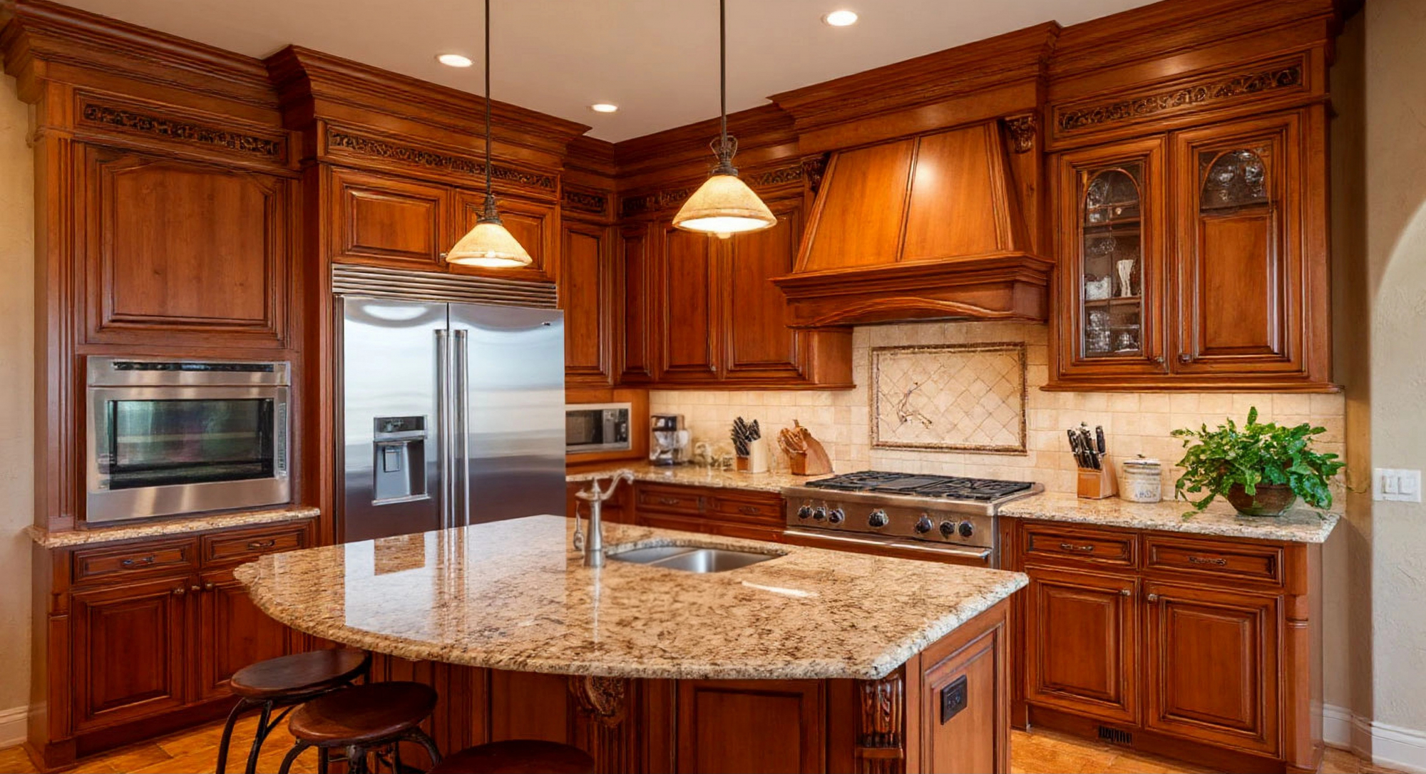 Интерьер кухни продуман до мелочей. От плавных линий фасадов до интеграции встроенного холодильника — всё направлено на создание гармоничного пространства. Сочетание теплых оттенков, качественных материалов и функциональных решений обеспечивает комфорт, практичность и эстетическое удовольствие одновременно.