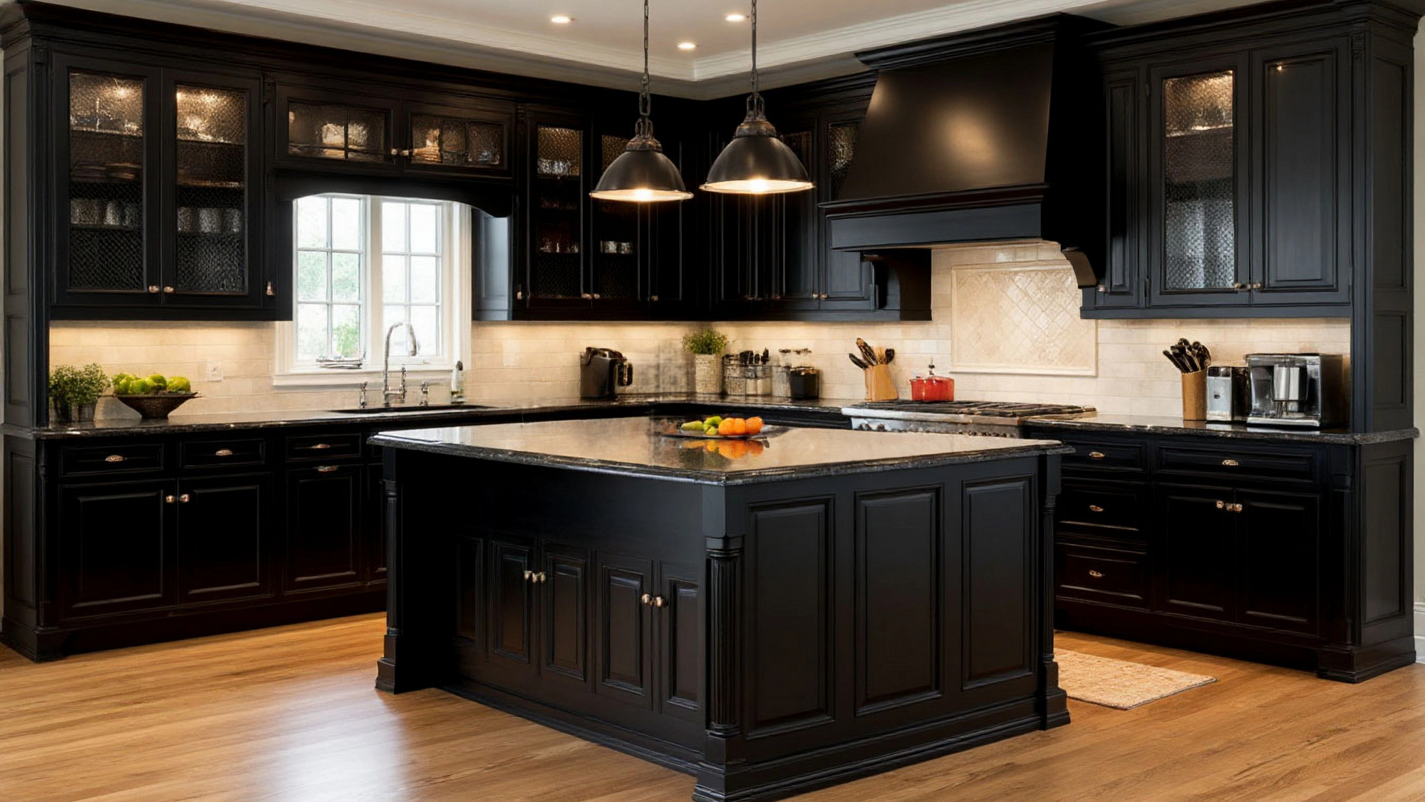 Эта кухня демонстрирует классический стиль в его совершеннейшем проявлении: симметрия, пропорции и внимание к деталям создают ощущение порядка и гармонии. Резные элементы, мягкие декоративные карнизы, декоративные рамки на фасадах и аккуратная фурнитура придают кухне характер, не перегружая пространство. В то же время строгие прямые линии и лаконичные поверхности фасадов добавляют современности, создавая идеальный баланс между традицией и актуальным дизайном. Особый шарм кухне придают легкие декоративные элементы, выполненные вручную, которые оживляют фасады и создают неповторимую игру света на черной поверхности.